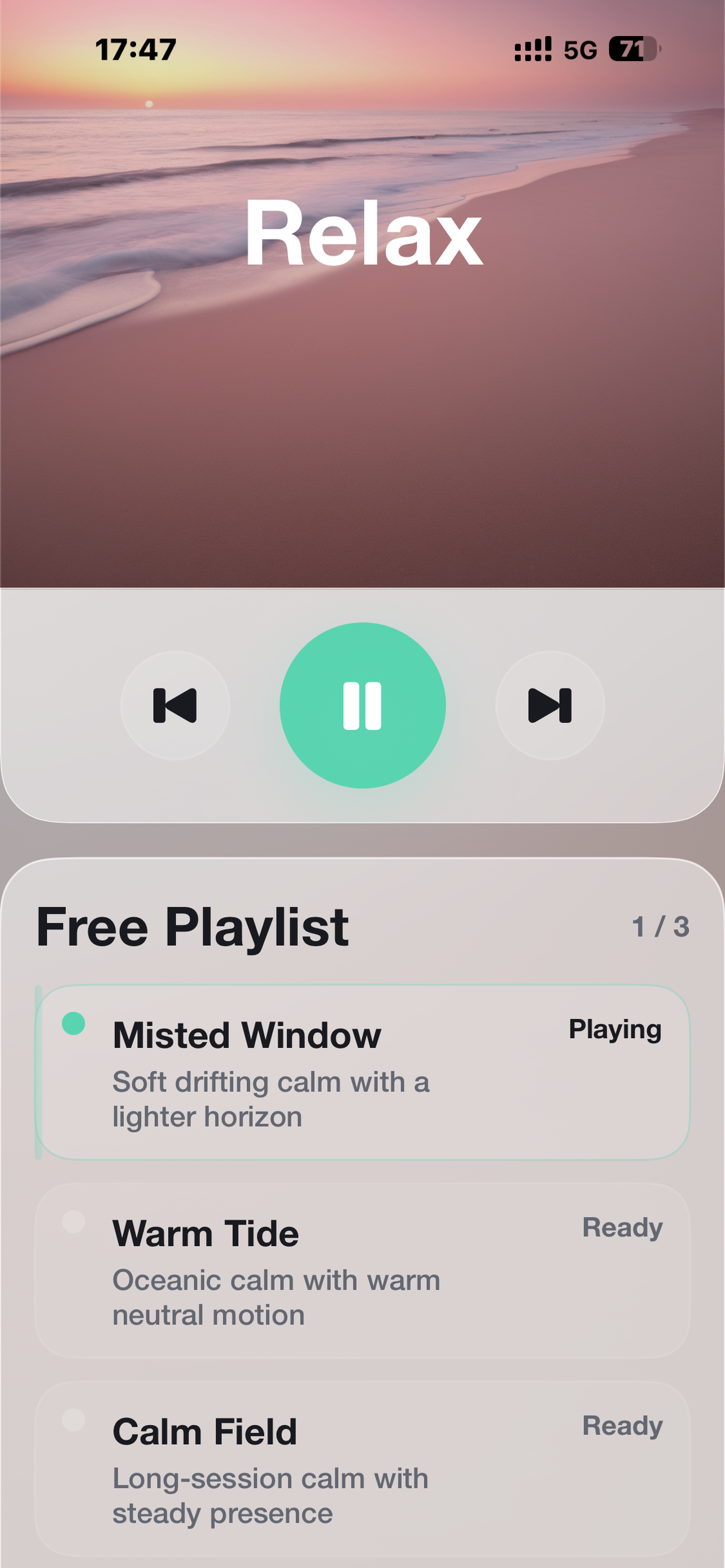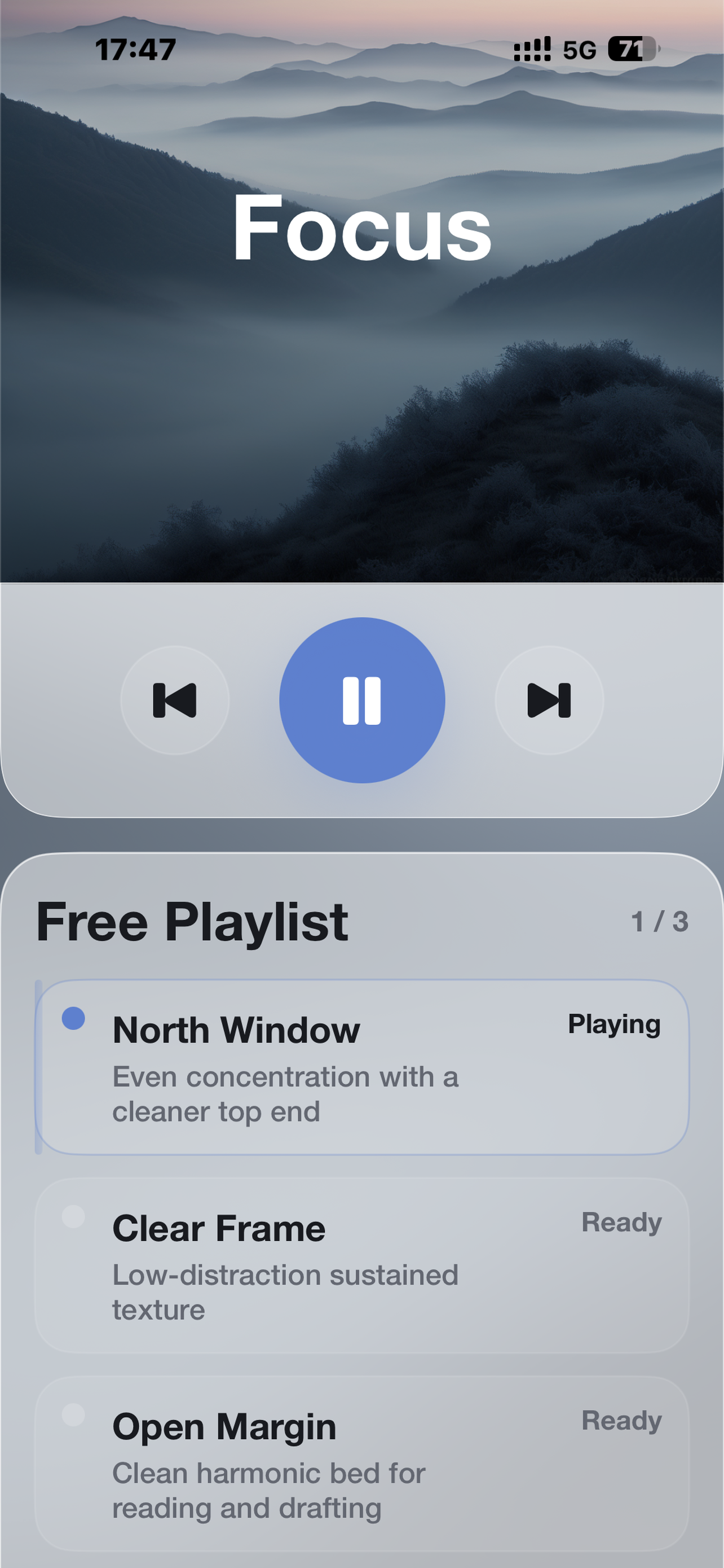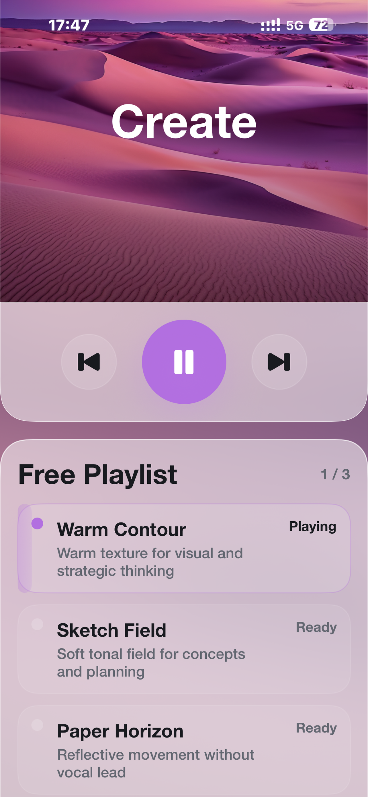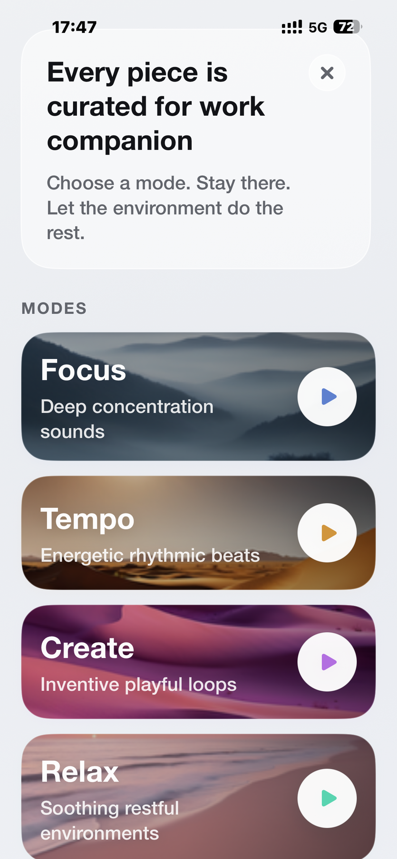 Audio for Work is not just a music app. It is a structured audio environment designed to help you enter focus, maintain rhythm, unlock creativity, and recover when needed.
